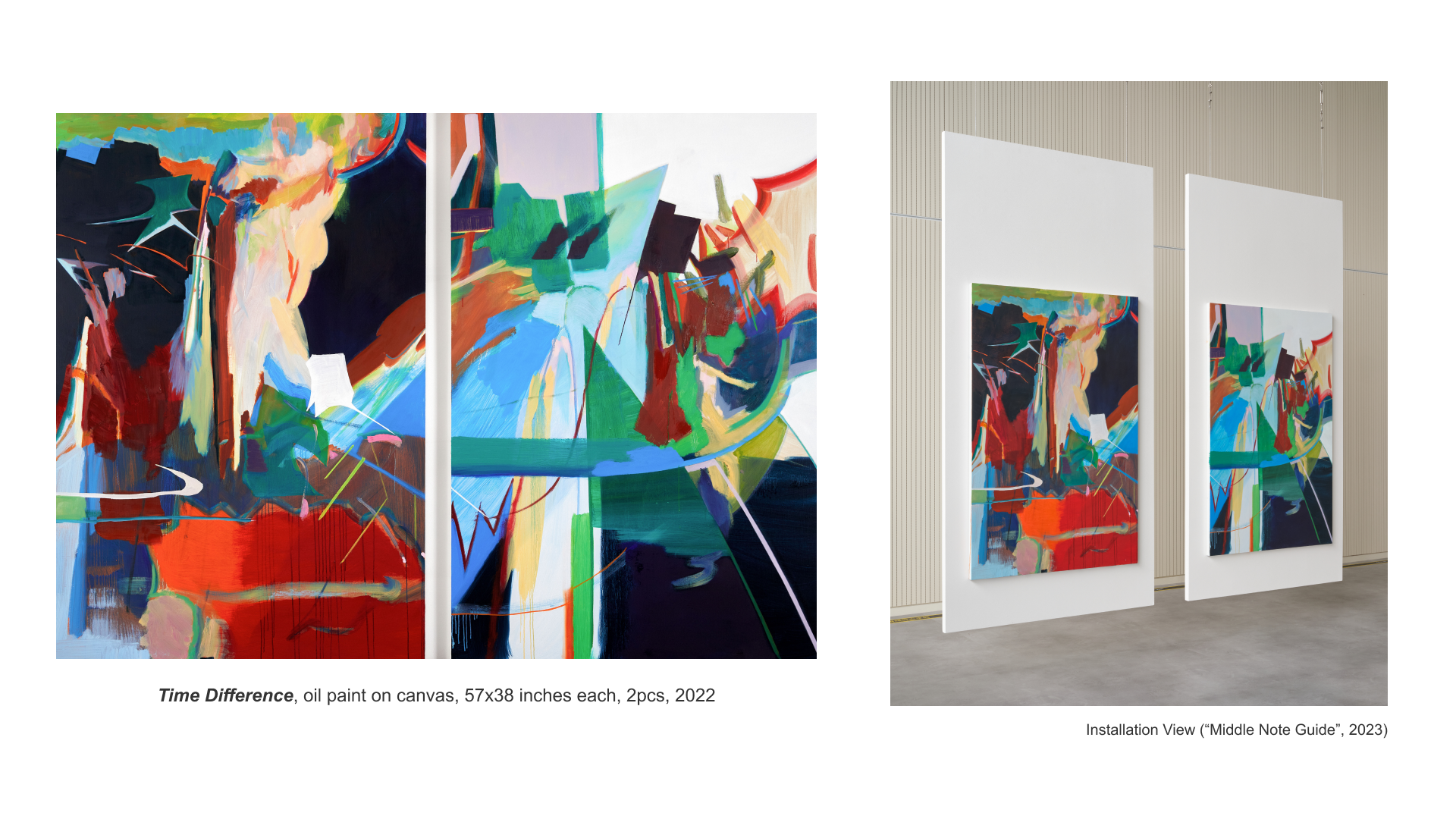 I tried to show the repetition of two similar but different periods by arranging two canvases, which create the time difference first "inside screen" through parallel images and second "within a perspective gap" by installing the paintings on a suspended wall in the air.